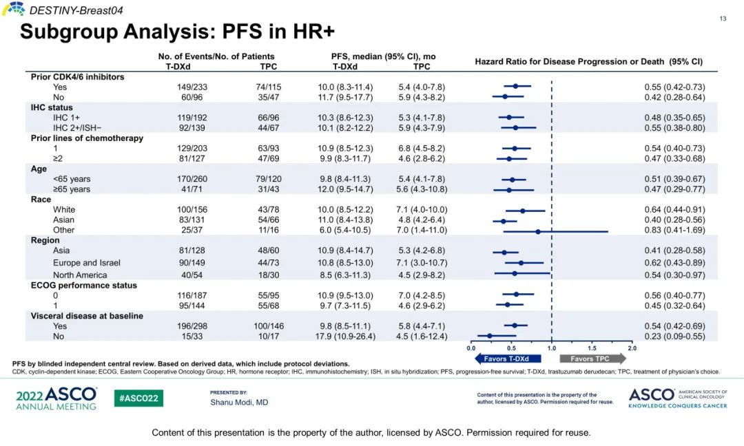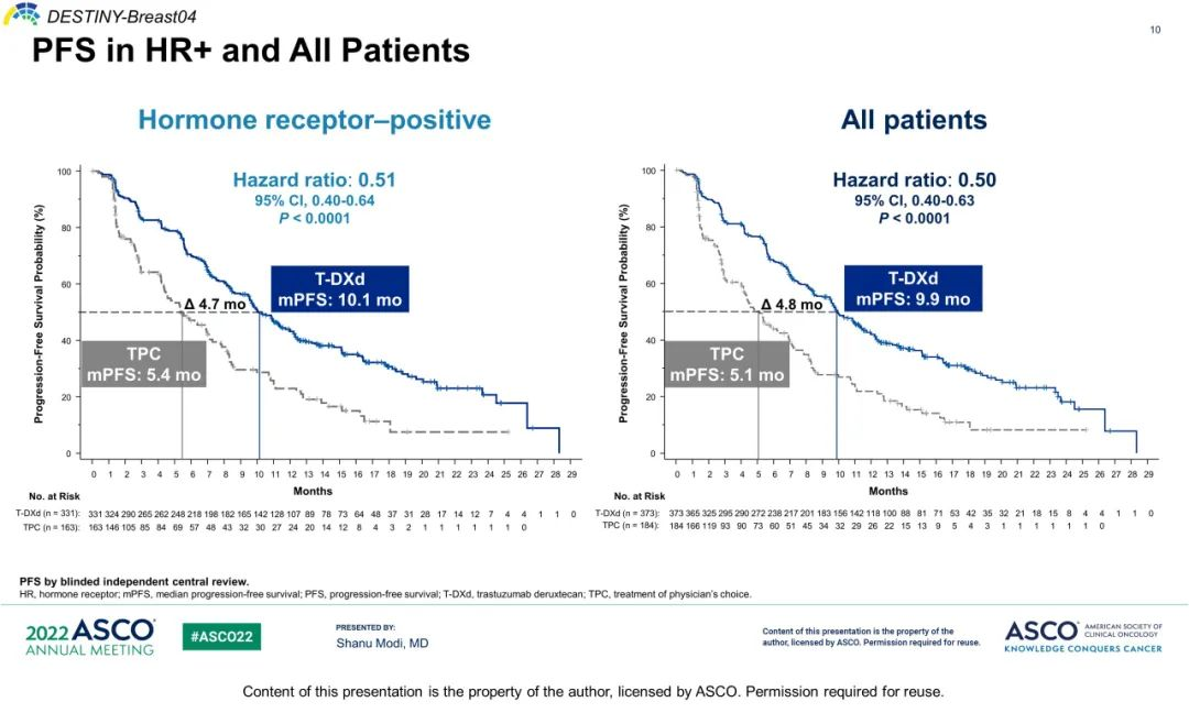 2022年美国临床肿瘤学会年会——芝加哥当地时间6月5日下午3点半,备受瞩目的DESTINY-Breast04研究结果报道,McCormick会议中心响起了经久不息的掌声。DESTINY-Breast04研究作为乳腺癌领域唯一入选全体大会环节(Plenary Session)的重磅研究,为激素受体阳性晚期乳腺癌患者再添有力的临床数据,为晚期治疗阶段经内分泌和化疗治疗后仍进展的患者提供了又一振奋人心的数据。更重要的是,在HER2-的芸芸众生中,DESTINY-Breast04犹如一道光,照亮了其中HER2低表达人群的命运。在HR+患者中,T-DXd治疗组中位PFS相较于TPC治疗延长4.7个月(10.1 vs 5.4个月),疾病进展或死亡风险显著降低49%(HR 0.51,95%CI:0.40~0.64,P<0.001)。现场专家热烈的掌声表达了在一线与乳腺癌疾病做斗争的医生们对研究结果高度的认可。