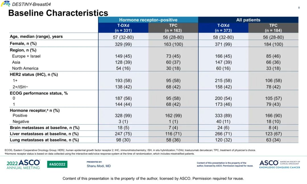 从基线人群看,99%为女性患者。人群地区分布于欧洲(~45%)、亚组(~40%)和北美洲(~20%),人群具有广泛的世界地区代表性,同时亚洲人群的样本量也足以使得该研究可以代表T-DXd在亚洲人群的疗效。同时在HER2低表达的人群分布上,DESTINY-Breast04入组患者中,很好的均衡了HER2 1+和2+/ISH-的患者。