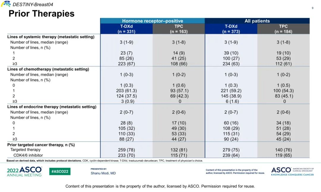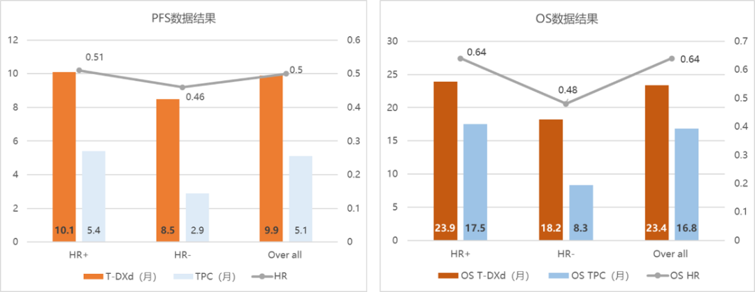 我们很欣喜的看到了研究达到主要终点,HR+人群获得了PFS获益。且在所有患者中,T-DXd组和医生选择组的中位PFS分别为9.9个月(95%CI:9.0~11.3)和5.1个月(95%CI:4.2~6.8)(疾病进展或死亡的风险比,0.50;95%CI:0.40~0.63;P<0.001)。