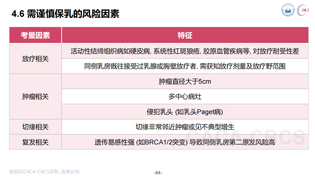 我们中心开展保乳手术的历史比较长,已经积累了二十多年的实践经验。过去主要参考NCCN等国际指南,但这些指南与国内情况存在较大差异;现在的CBCS等国内指南则更加贴近中国国情,从肿瘤大小、外形影响、病灶数量、安全切缘、主观意愿等因素进行考量,总的来说可以概括为两大基本要求:一是“切缘阴性+恢复外观”,二是“无放疗禁忌症”。此外,多病灶、不能保留乳头、切缘非典型增生、BRCA遗传易感基因等都是相对禁忌症,有一些相关研究讨论了此类患者保乳手术的复发风险。