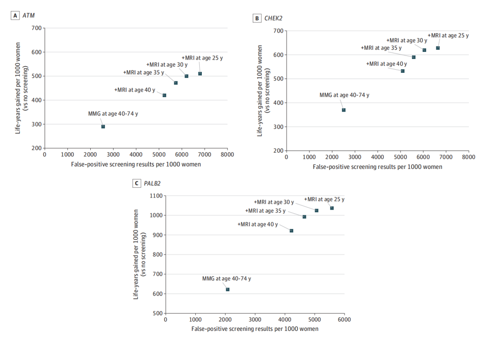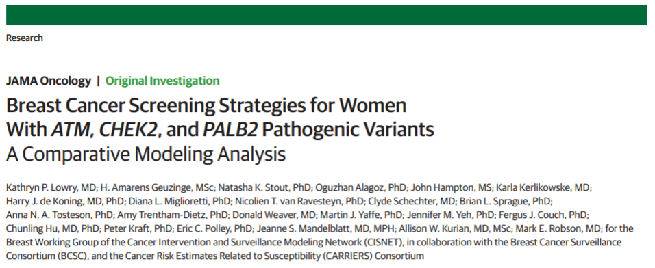 [5]Lowry KP, Geuzinge HA, Stout NK, et al. Breast Cancer Screening Strategies for Women With ATM, CHEK2, and PALB2 Pathogenic Variants: A Comparative Modeling Analysis [published online ahead of print, 2022 Feb 17]. JAMA Oncol. 2022;10.1001/jamaoncol.2021.6204.
