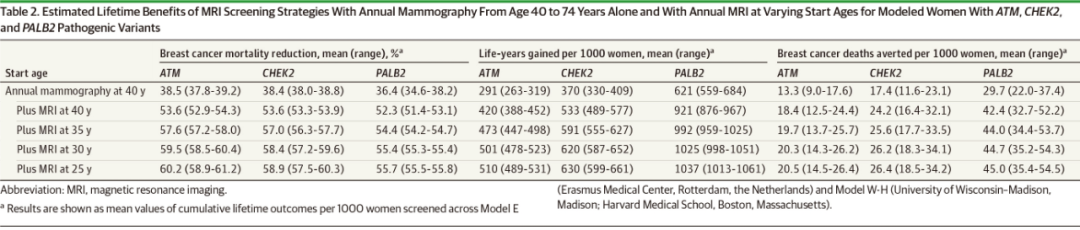 该研究结果表明,从30至35岁开始进行MRI筛查,然后在40岁时进行MRI联合钼靶筛查,可能会使携带ATM、CHEK2和PALB2致病性突变女性的乳腺癌死亡率降低50%以上。在MRI筛查中,40岁之前联合钼靶筛查可能没有额外的益处。