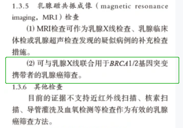 尽管上述研究确定了有临床意义的乳腺癌易感基因,但目前临床上的乳腺癌筛查策略包含的易感基因仅有BRCA1/2突变。例如,美国USPSTF建议对乳腺癌、卵巢癌、输卵管癌、腹膜癌或有BRCA1/2基因突变家族史的人群进行风险评估,风险阳性人群应接受遗传咨询、基因检测等。《中国抗癌协会乳腺癌诊治指南与规范》建议将MRI联合X线用于BRCA1/2突变携带者的乳腺癌筛查。