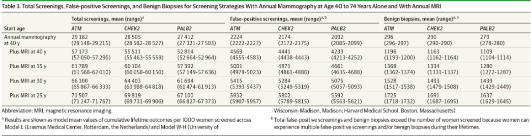 筛查起始年龄包括从25岁、30岁、35岁或40岁开始,一直到74岁,筛查方法为每年一次的钼靶和MRI检查。