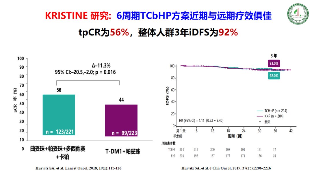 1、HER2阳性乳腺癌新辅助治疗方案:经典的KRISTINE研究证实:6周期TCbHP方案tpCR为56%,整体人群3年iDFS为92%,近期与远期疗效俱佳。正是基于此项研究,CBCS指南推荐双靶方案作为HER2阳性乳腺癌新辅助治疗的优选方案。
