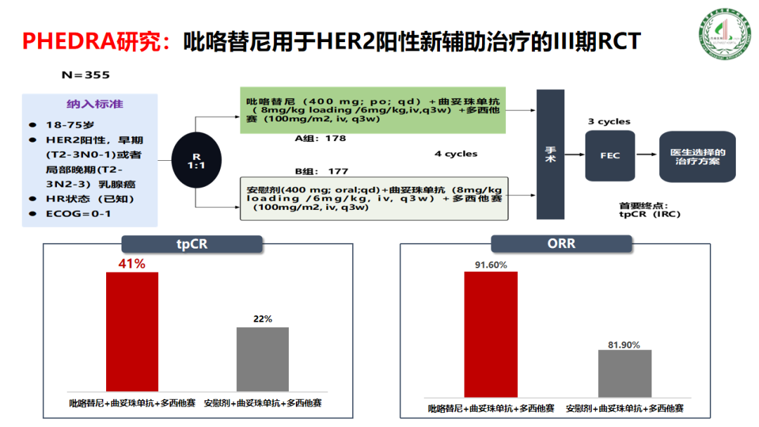 随着大小分子联合在HER2阳性乳腺癌新辅助治疗中的不断探索,TKI+H方案展示出了与曲帕双靶相当的疗效。PHEDRA研究是吡咯替尼用于HER2阳性乳腺癌新辅助治疗的Ⅲ期RCT研究,此研究中吡咯替尼+曲妥珠单抗+多西他赛组的tpCR为41%,相较对照组提高了19%,ORR为91.6%,展示出了大小分子联合的优势,也正是基于此数据,2022年5月31日,吡咯替尼新辅助适应症正式获批,为新辅助患者提供了新的可选方案。