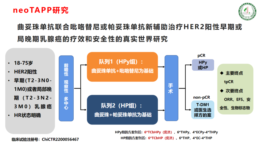 既往国内外指南主要推荐曲妥+帕妥作为新辅助治疗的首选方案,但是随着各项研究数据的公布,我们可以看到曲妥+吡咯替尼也展现出了优异的数据,也是可以作为HER2阳性乳腺癌新辅助治疗的策略,那么到底哪个方案更好?或者哪个方案会在特定的人群中取得更好的疗效呢?这也是临床医生即将面临的难题,正是基于此种现状,齐晓伟教授注册了一项前瞻性、全国多中心的临床研究,对比曲妥+吡咯替尼和曲妥+帕妥的疗效以及安全性,也让我们期待在不久的将来能够看到这项研究的数据,也期待全国同道加入该研究共同解决中国临床实践新问题。