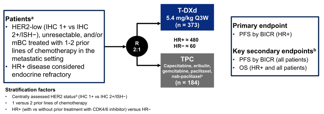 DESTINY-Breast04是以HER2低表达为入组对象,在筛选病人的过程中,约89%是HR+/HER2低表达(n=480),但同时还有约11%的患者为HR-/HER2低表达(n=60),这一比例也与真实世界两类患者的比例相符。