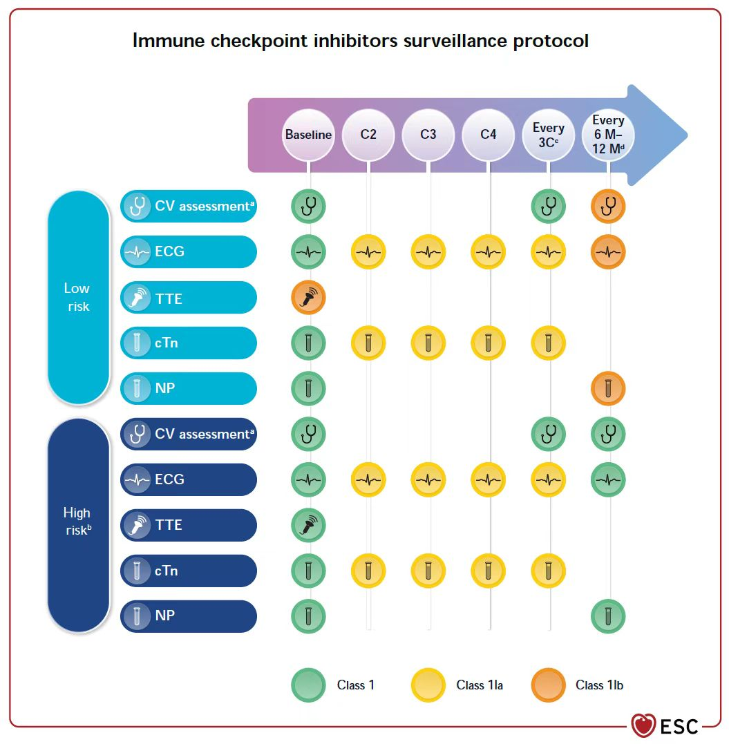 免疫相关CV副作用可能导致危及生命的CV并发症,如暴发性心肌炎、心包炎、心功能障碍、心律失常或心肌梗死。ICI相关心肌炎患者出现早期症状(中位数为首次接触ICI后30天),高达50%死亡ICI治疗期间描述的其他CV毒性包括心肌梗死、房室传导阻滞、室上性和室性心律失常、猝死、takotsubo样综合征、非炎症性心衰、高胆固醇血症、心包炎、心包积液、缺血性卒中、和VTE。因此ICI治疗期间的监测具有挑战性。建议在接受ICI治疗前,所有患者均应接受ECG、NP、cTn监测。建议高危患者在开始ICI治疗前进行基线超声心动图检查。在ICI第2、3和4次给药前应连续监测ECG和cTn,如果正常,则减少至每3次给药检测一次,直到治疗完成。对于需要长期(例如>12个月)治疗的患者,根据情况(尤其是高危患者)考虑每6~12个月进行一次CV评估。