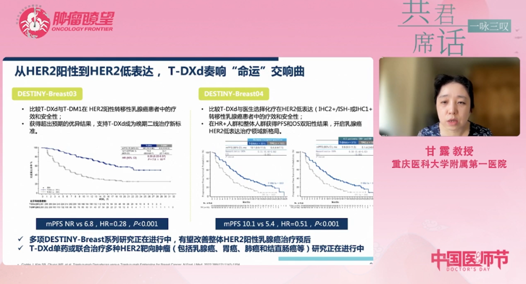 编者按:2022年8月19日是第五个“中国医师节”,在这个特殊的节日里,《肿瘤瞭望》特别邀请数位“撑起半边天”的女性医务工作者,开展了“HER风采”主题学术研讨会。河南省肿瘤医院闫敏教授担任本次大会主席,西安交通大学第一附属医院杨谨教授、重庆医科大学附属第一医院甘露教授进行了精彩授课,并与浙江省肿瘤医院陈占红教授、复旦大学附属肿瘤医院王磊苹教授、中国医科大学附属第一医院石晶教授共同就DESTINY-Breast03、DESTINY-Breast04研究进展进行了“杏林玫瑰面对面”的互动讨论,本文就相关内容进行回顾。