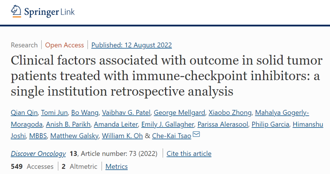编者按:免疫检查点抑制剂(ICI)的临床应用相当程度地改变了癌症治疗的前景,目前已在多个瘤种广泛应用,并且取得了良好的治疗效果及可控的安全性。然而由于ICI治疗的复杂性,目前临床尚未有有效的预测ICI治疗效果的预测因子。对此美国西奈山伊坎医学院Tisch癌症研究所Qian Qin等人开展了一项真实世界研究,以确定实体瘤患者接受ICI治疗后可能的疗效相关的潜在临床特征,从而指导未来的临床试验患者分层。《肿瘤瞭望》特此报道,欢迎各位读者交流讨论。