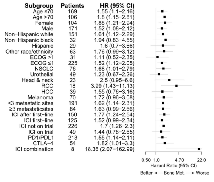 研究共纳入297例应用ICI治疗的患者,其中非小细胞肺癌81例(27.3%)、黑色素瘤73例(24.6%)、肝细胞癌51例(17.2%)、泌尿上皮癌51例(17.2%)、头颈部鳞状细胞癌23例(7.7%)、肾细胞癌18例(6.1%)。经多因素分析,ECOG评分≤ 2的良好表现状态和癌症家族史与ICI应答改善相关。骨转移与较差结局相关。