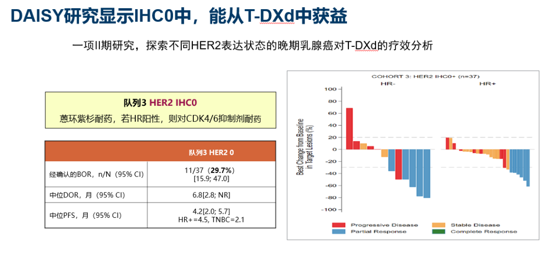 对于HER2低表达的下限,当前仍然存在着争议。DAISY研究15探究了新型ADC药物DS8201对不同HER2表达状态乳腺癌患者的疗效,研究结果提示我们,DS8201对于HER2 IHC 0的患者仍然有30%左右可从DS8201治疗中获益。针对这一研究这些问题仍值得我们思考:是否更低的HER2表达患者也能从ADC药物治疗中获益?是否更低的HER2表达患者也可以归为HER2低表达人群?