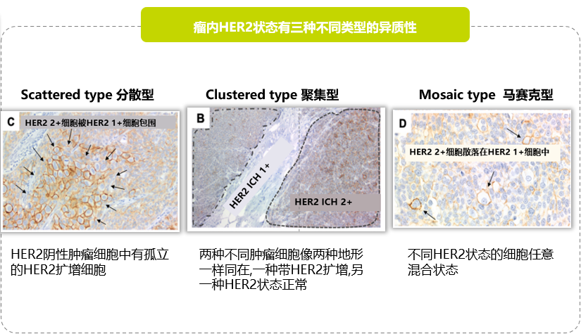 包括乳腺癌在内的各类肿瘤中,肿瘤内遗传异质性已得到大家的充分认识。HER2蛋白过表达或基因扩增也呈现异质性模式16。HER2瘤内异质性是指同一肿瘤内部存在多个不同HER2扩增或表达状态的克隆群17。HER2异质性肿瘤有3种分布方式:聚类型、马赛克型以及分散型16。肿瘤内异质性包括空间和时间异质性两个维度18。乳腺癌中HER2表达具有空间和时间异质性,在空间上,即使同一个肿瘤内,HER2也可以表现为“聚类型”、“马赛克型“和“分散型”分布。在时间上,原发灶和转移灶间HER2表达状态可能不同,在既往HER2阳性患者判读的时候同样存在19-20。