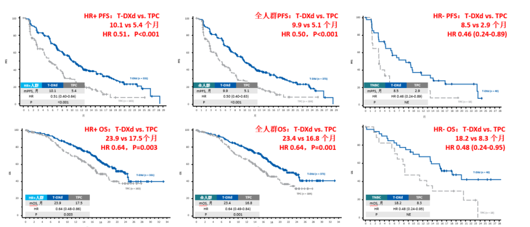 DB-04研究22结果显示:在总体人群(无论HR状态)中,T-DXd可相较于医生选择化疗(TPC)显著延长患者PFS(9.9 vs 5.1 个月;HR 0.50,P<0.001)和OS(23.4 vs 16.8个月;HR 0.64,P=0.0010);而且在HR+患者中同样可以看到 PFS(10.1 vs 5.4 个月;HR 0.51,P<0.001)和OS(23.4 vs 16.8 个月;HR 0.64,P=0.0010)的显著获益;HR-患者(TNBC)是探索性研究人群,样本量较小,但也看到了PFS(8.5 vs 2.9 个月;HR=0.46)和OS(18.2 vs 8.3 个月;HR=0.48)的获益。