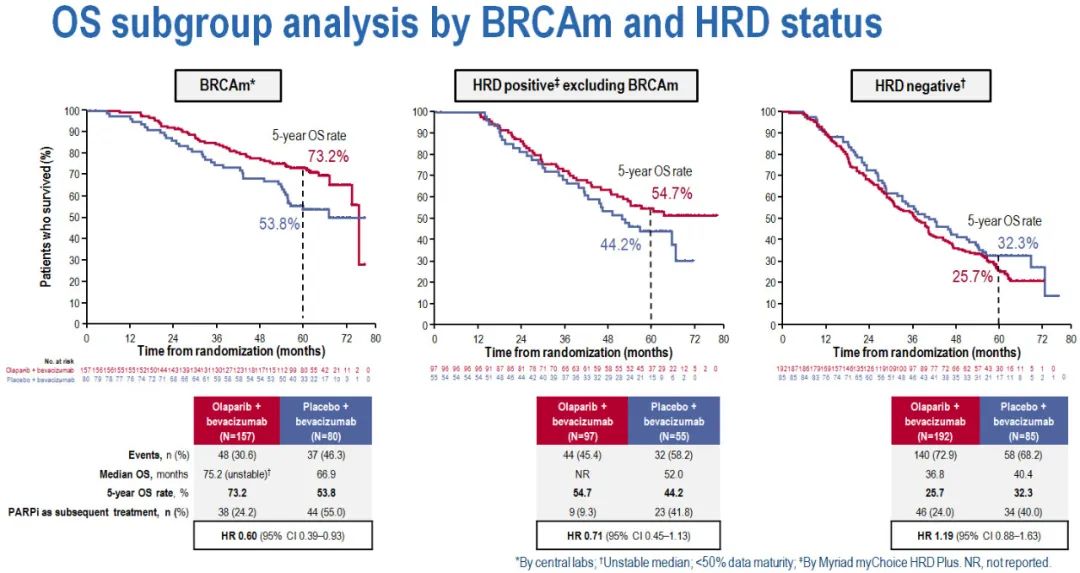 探索性分析显示,在HRD阳性的肿瘤患者中,加用奥拉帕利可将死亡风险降低38%(HR=0.62;95%CI: 0.45-0.85),5年OS率为65.5%,安慰剂组的5年OS率为48.4%;联合奥拉帕利的OS获益在携带BRCA突变的患者中更明显:5年OS率分别为73.2%和53.8%(HR=0.60;95%CI: 0.39-0.93),没有BRCA突变的患者的5年OS率分别为54.7% vs 44.2%(HR=0.71;95%CI: 0.45-1.13)。