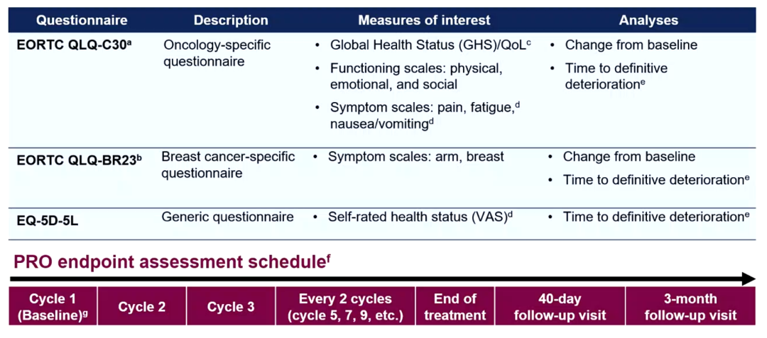 此次ESMO进一步报道了DB-04研究的次要终点,即HR阳性患者的患者报告结局(PROs)相关数据。研究采用EORTC QLQ-C30、EORTC QLQ-BR23、EQ-5D-5L等量表进行PRO评估。主要评价这些量表得分自基线以来的变化(CFB)、以及各种症状或健康状态的至恶化时间(TDD,评分≥10分)。PROs是患者对健康状况、功能状态以及治疗感受的自我报告。通过PROs可获得其他研究指标无法提供的关于QoL的数据,并从PFS、OS等常用评价指标以外,对患者的自身治疗获益、感受进行评价。对于乳腺癌等生存期较长的恶性肿瘤患者来说,PROs尤为重要,是对生存获益以外的重要补充。