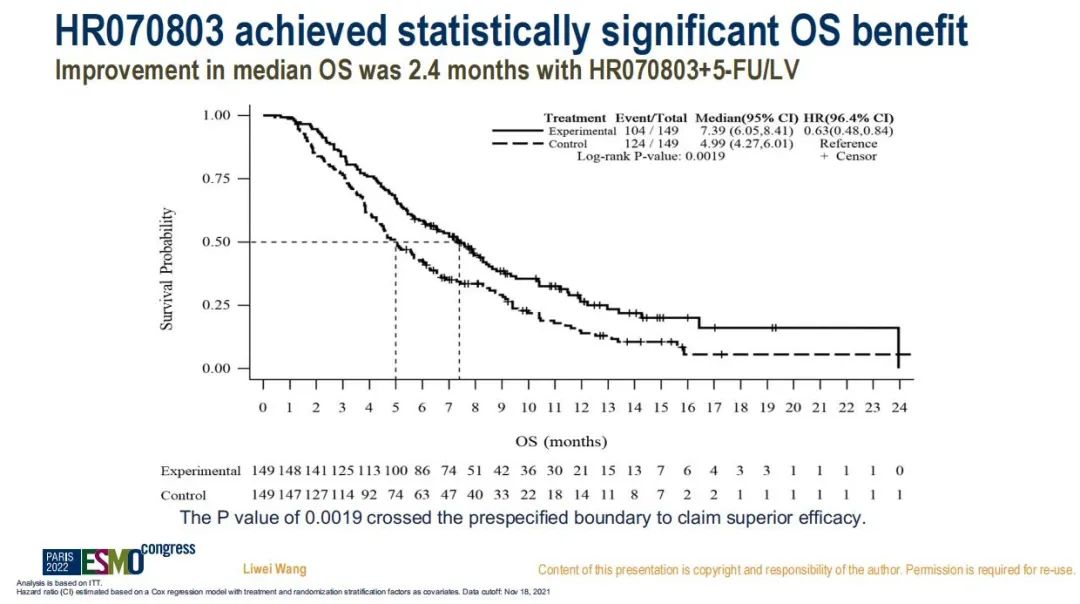主要研究终点中位OS:HR070803组对比安慰剂组分别为7.39个月和4.99个月(HR=0.63,P=0.0019),HR070803组相对安慰剂组显著延长了2.4个月中位OS。详见图2。