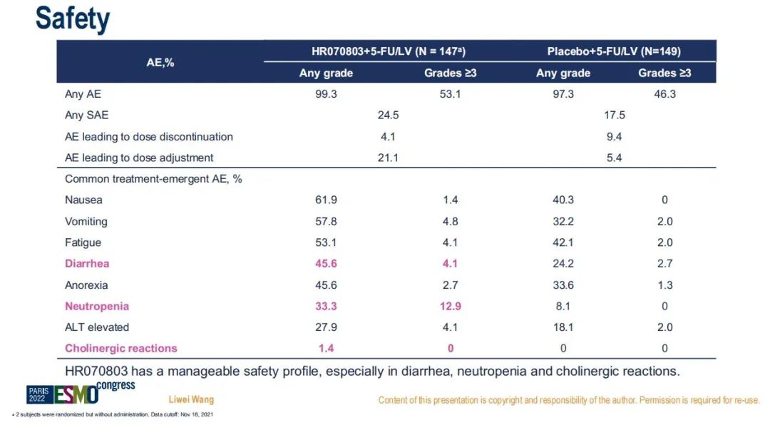 安全性方面:HR070803组3级及以上不良事件主要包括腹泻(4.1%),中性粒细胞减少(12.9%),呕吐(4.8%)等,相较普通伊立替康制剂,HR070803未报道3级及以上胆碱能反应不良事件,其他不良事件明显减少。对比安慰剂组,HR070803组不良反应均可控。详见表1。