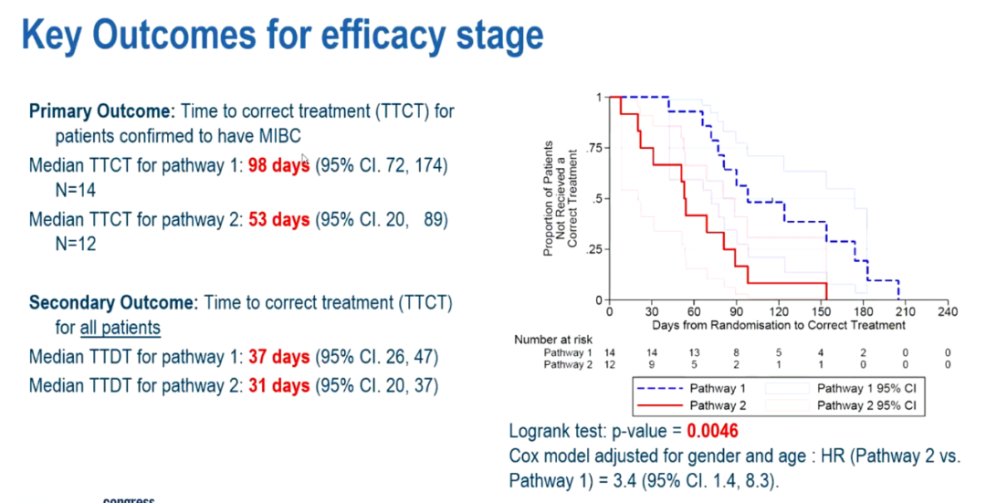 结果:在2018年5月至2021 12月期间,143名患者被随机分组,中位年龄74岁,47.9%可能为NMIBC,52.1%可能为MIBC。可行性阶段:95%(37/39;95%CI:83~99%)MIBC患者遵循正确路径。有效期:途径1(标准TURBT),MIBC获得正确治疗决策的中位时间为98(95%CI:72~174)天;途径2(基于MRI和活检)为53天(95%CI:20~89),二者危险比为3.4(95%CI:1.4~8.3)。Logrank检验:P值=0.0046。次要结局包括所有患者获得正确治疗决策的中位时间:路径1为37天,路径2为31天;HR为1.3(95%CI:0.9-1.8)。