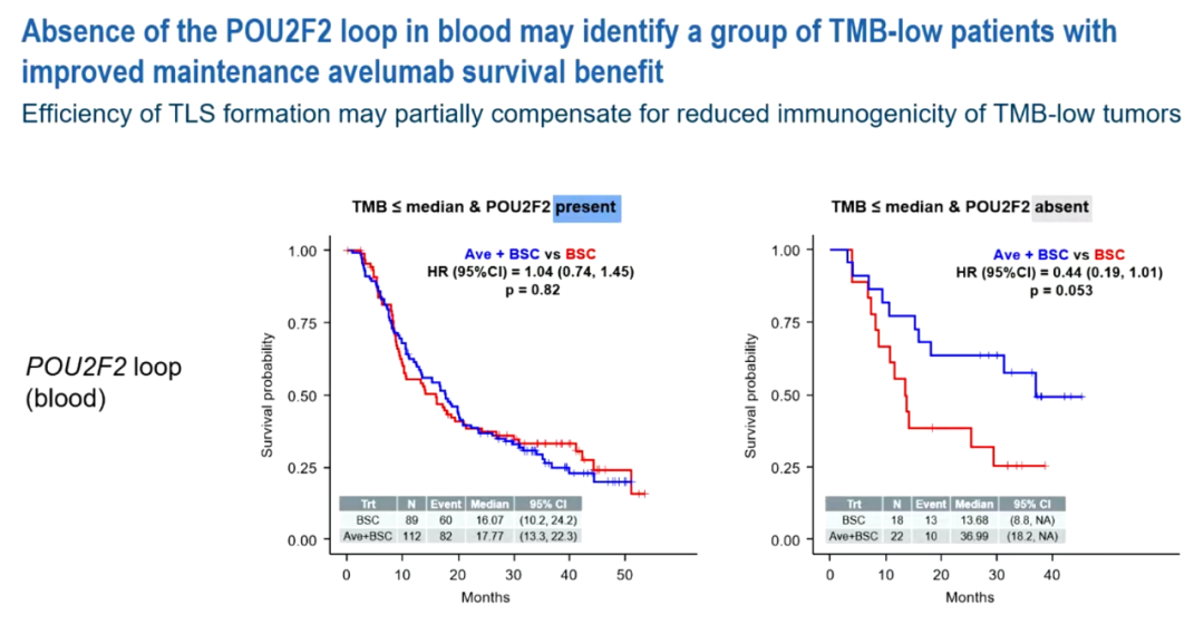 结果:从训练集中识别出25个CCS。一个CC接近于POU2F2,这是一种有助于B细胞发育的转录因子。外周血缺乏POU2F2 CC的患者肿瘤JR101I评分升高,相应与三级淋巴结构(TLS)相关的基因表达增加。因此,POU2F2 CCS可能是影响TLS形成的关键步骤。在中位肿瘤负荷(TMB)为每Mb 7.66个非同义SNV的患者中,在无POU2F2 CCS的患者中,阿维鲁单抗+BSC与BSC的风险比为0.44(95%CI:0.19~1.01;P=0.053);在有POU2F2 CCS的患者中,两组的风险比为1.04(95%CI:0.74~1.45;P=0.82)。影响TLS形成能力的CCS可能影响低TMB对阿维鲁单抗的反应。