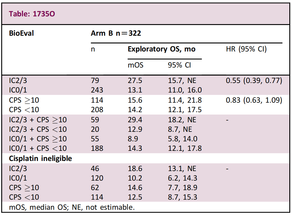 背景:PD-L1分析使用各种方法(如肿瘤和/或免疫细胞评分)预测PD-L1/PD-1阻断结局。数据表明,临床相关的PD-L1表达免疫细胞(IC)是树突状细胞(DC)(Oh 2020)。本研究探讨了在3期IMvigor130试验(ITT人群:HR 0.68,95%CI:0.43~1.08;顺铂不适合人群:HR 0.53,95%CI:0.30~0.94)(Galsky ASCO-GU 2021;2019年5月31日截止)中,单用阿替利珠单抗(atezo;抗PD-L1;B组)与安慰剂+铂类/吉西他滨化疗(化疗;C组)对SP142检测PD-L1高表达患者(PT)有利OS趋势的临床和免疫学基础。