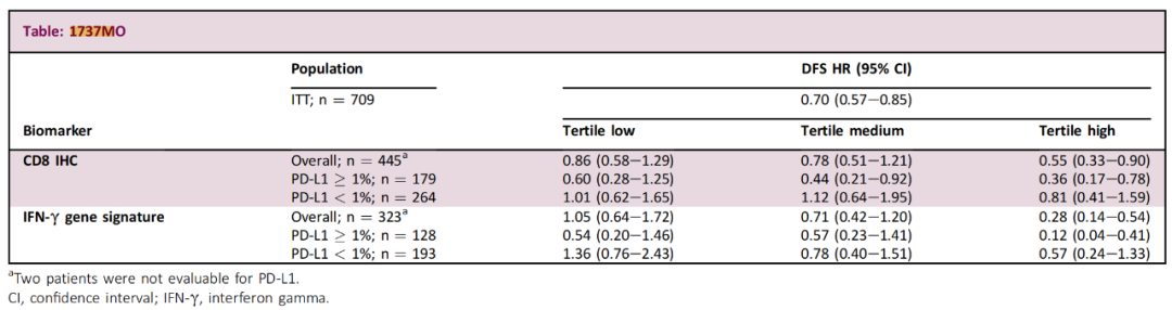 结果:在709例随机患者中,分别有458、445和323例可评估TMB、CD8 IHC和RNA序列。TMB、CD8+ T细胞浸润和IFN-γ特征评分(下表)与NIVO组的DFS呈正相关。在PD-L1≥1%的患者中,关联更为明显。在这3种生物标志物中,IFN-γ标志物与DFS的相关性在不同组中最强。