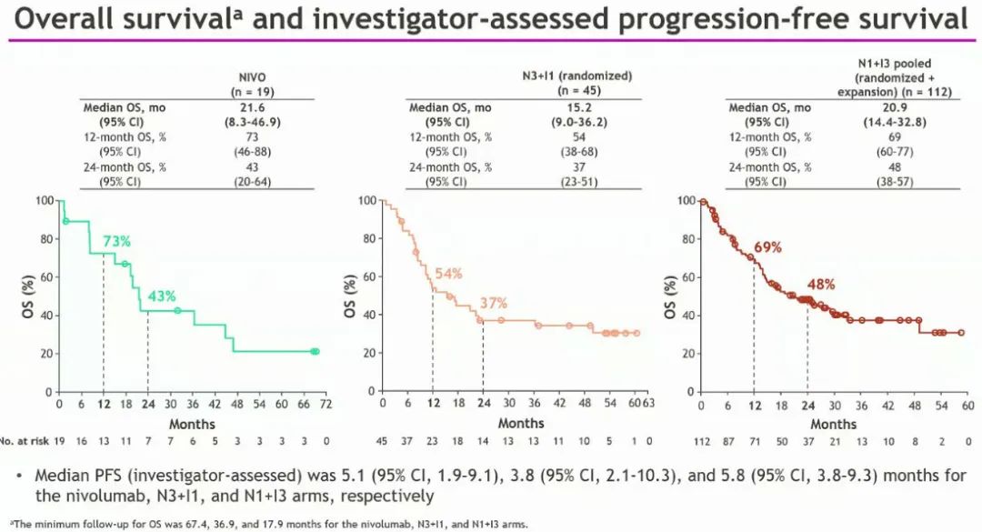 在中位随访30.4个月后,研究人员评估的N1+I3方案的客观缓解率(主要终点)高于N3+I1或N单药治疗组(分别为38.4%、31.1%和26.3%)。N3+I1或N1+I3治疗组的中位缓解持续时间(DOR)分别为24.4个月和34.1个月,而使用N单药治疗的患者没有达到中位缓解持续时间。N单药、N3+I1和N1+I3组的中位总生存期为21.6个月(95%置信区间[CI]: 8.3-46.9)、15.2个月(95%CI: 9.0-36.2)和20.9个月(95%CI: 14.4-32.8),中位无进展生存期分别为5.1个月(95%CI: 1.9-9.1)、3.8个月(95% CI: 2.1-10.3)和5.8个月(95%CI: 3.8 - 9.3)。