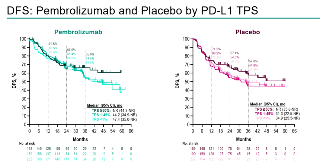 首先,我们研究了患者的特征。ITT和高PD-L1患者的基线特征、毒副作用、药物暴露等都没有显著差异。因此,我们不得不回到K-M生存曲线上,随着时间延长,PD-L1高表达组患者的DFS获益相较于TPS 1-50%以及TPS<1%的患者更显著,越到后来,生存曲线拉开得越明显。出乎意料的是,安慰剂组中也有这种趋势,高PD-L1组患者获益更好。我们知道在化疗中,PD-L1并不能作为预后因素;即使将PD-L1作为预后因素,也可能代表更差的预后,而这项研究却得出相反的结果。可能有很多综合因素导致这样的结果,尤其是在高PD-L1患者中。因此,我们得出的结论是,帕博利珠单抗是所有PD-L1亚组患者的有效选择。