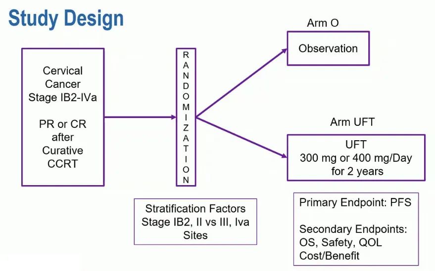 本研究入组要求受试者为FIGO(2009)Ib2-IVa期宫颈鳞癌、腺癌或腺鳞癌患者,已完成CCRT治疗,且达到完全缓解(CR)或部分缓解(PR),年龄25-75岁,ECOG PS评分0-2,具有充分的器官功能。试验排除CCRT后行子宫切除术、接受过子宫颈癌剖腹探查术、存在残端肿瘤、CCRT前行新辅助化疗、伴随活动性感染和无法控制的并发症、活动期多发肿瘤、腹泻、不适宜的精神障碍以及对UFT成分有过敏史的患者。入组患者被随机(1:1)分配至仅观察组(O组)或UFT维持治疗组(UFT组)。体表面积(BSA)≥1.25m2的患者口服UFT剂量为400mg/天,BSA<1.25m2的患者为300mg/天。患者接受UFT治疗两年,直至疾病进展或发生不可耐受的毒性反应。主要研究终点为无进展生存(PFS),次要研究终点包括总生存(OS)、安全性和生活质量。单侧显著水平为0.05。