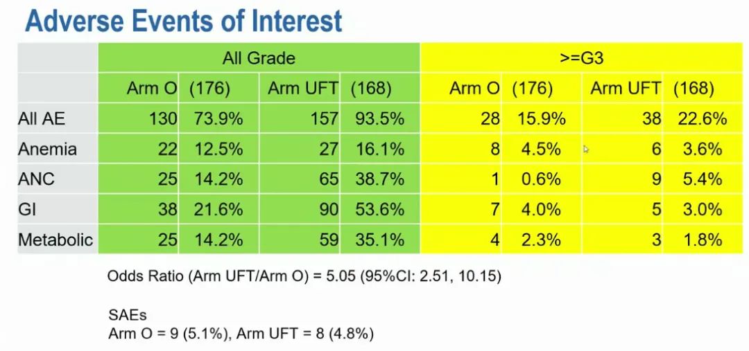UFT组的不良事件(AE)明显多于观察组,全级别不良事件发生率分别为93.5% vs. 73.9%(比值比[OR]为5.05,95% CI: 2.51-10.15),大多数AE为1或2级。≥3级AE在观察组的发生率为15.9%,在UFT组为22.6%。