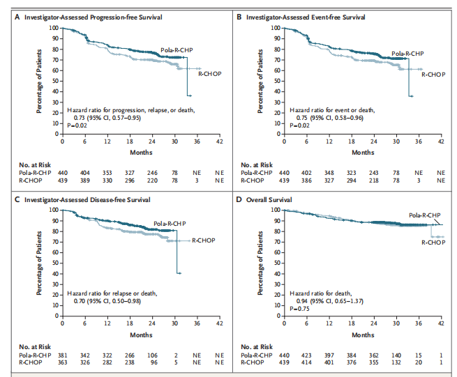 许彭鹏教授:POLARIX是一项全球多中心、随机对照的III期临床研究,我们中心也是该研究的参与单位之一,其不同阶段的研究结果先后在国际大型学术会议上进行了报道,随后正式发表于“新英格兰医学杂志(NEJM)”。该研究的结果表明:①对于初治、非低危的弥漫大B细胞淋巴瘤(DLBCL)患者而言,较之于经典的R-CHOP方案而言,维泊妥珠单抗(polatuzumab vedotin)联合R-CHP方案(pola-R-CHP)能显著改善患者的无进展生存(PFS,主要研究终点);②安全性方面,pola-R-CHP方案的毒副作用与R-CHOP方案并无显著的差异。通过POLARIX这项研究,奠定了维泊妥珠单抗联合R-CHP在初治DLBCL中的疗效依据,也提供了切实的循证医学数据。