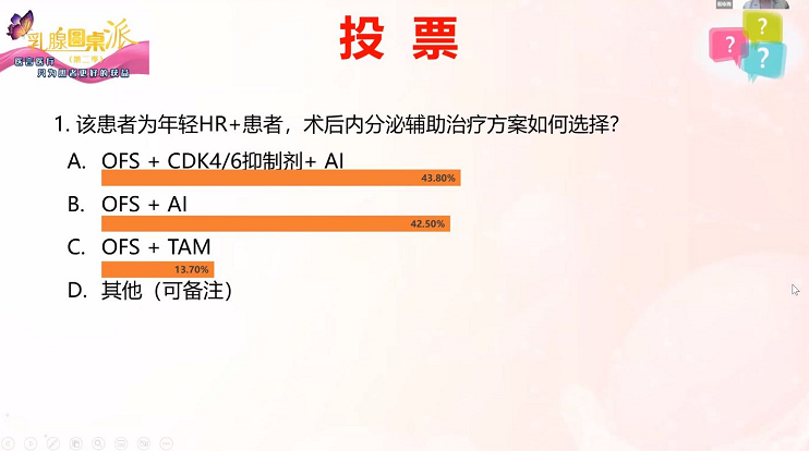 网上医生投票结果揭晓:43.8%的医生支持OFS+CDK4/6抑制剂+AI,也有42.5%的医生支持OFS+AI,13.7%的医生指出OFS+TAM。