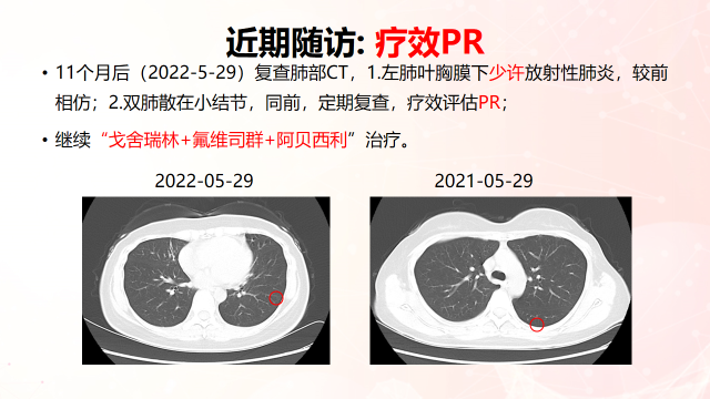 姚静教授:这种情况下,我首先会跟患者沟通,尽可能再次取活检,因为对晚期患者,再次确定病理分型对后续诊疗是非常关键的。该患者的肺部CT与以往相比,有多发的新增结节且高度怀疑肺转移。尽管取样条件不允许或者患者再次拒绝进行肺穿刺活检,结合肺部CT情况,考虑该患者为乳腺癌肺转移,建议患者在OFS的基础上联合氟维司群和CDK4/6抑制剂。