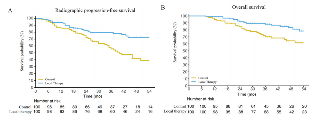 △复旦肿瘤发起全球首个寡转移mHSPC手术治疗的II期试验:影像学无进展生存(A)和总生存(B)曲线(Dai Bo,et al.Eur Urol Oncol,2022 Jun)