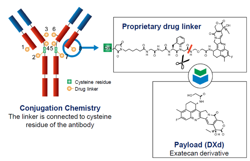 T-DXd应用可裂解连接子,高活性的拓扑异构酶Ⅰ抑制剂DXd作为有效载荷,脱氨化设计的DXd跨膜进入邻近肿瘤细胞,发挥旁观者效应,能够有效提高抗肿瘤效果。