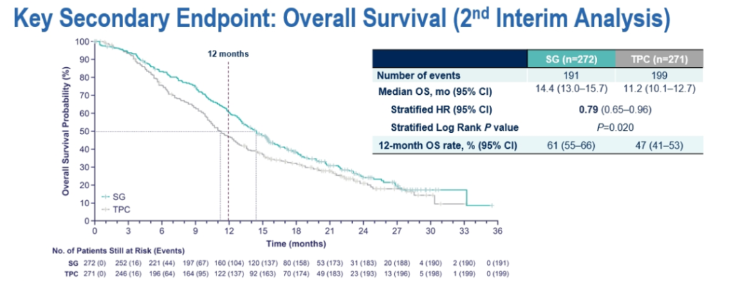 TROPICS-02研究结果提示在内分泌耐药经历过至少2线但不超过4线化疗ER+/HER2-晚期乳腺癌患者,SG组对比TPC组中位PFS为5.5个月,今年ESMO大会公布最新数据显示SG组对比TPC组中位OS为14.4 vs 11.2个月(HR=0.79),ORR(21%vs 14%),再一次证明SG在不同肿瘤、同一肿瘤不同亚型肿瘤中应用前景值得期待。