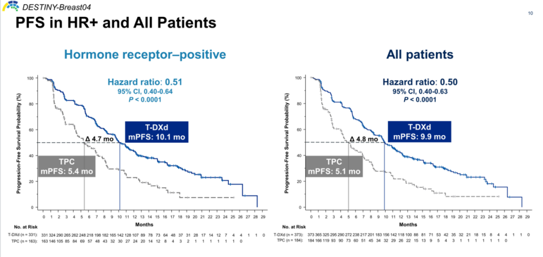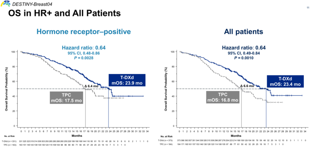 △图5.DESTINY-Breast04研究HR+患者和全体人群的PFS和OS结果