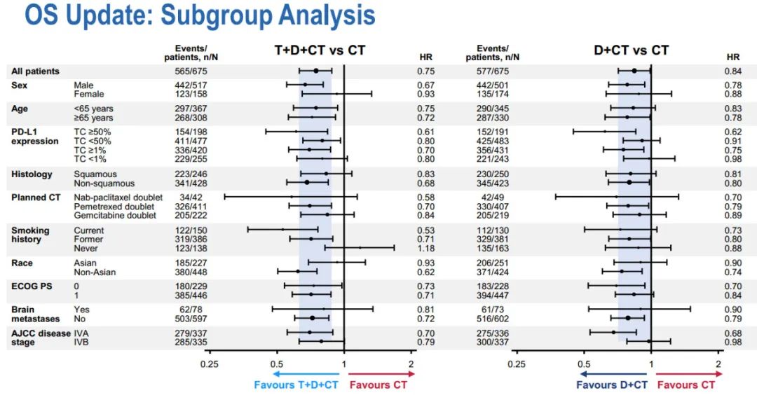 主要研究终点为盲法独立审查委员会(BICR)根据RECIST v 1.1标准评估D+CT组vs CT组的无进展生存期(PFS)和OS。次要终点由主要终点的结果触发,包括BICR评估的T+D+CT组vs CT组的PFS和OS。中位随访34.9个月时,与化疗相比,T+D+CT三联方案一线治疗可显著改善PFS(PFS HR=0.72,P=0.0003)和OS(OS HR=0.77,P=0.0030)。与化疗相比,D+CT可明显改善PFS(PFS HR=0.74,P=0.0009),OS有获益趋势(OS HR=0.86;P=0.0758)。