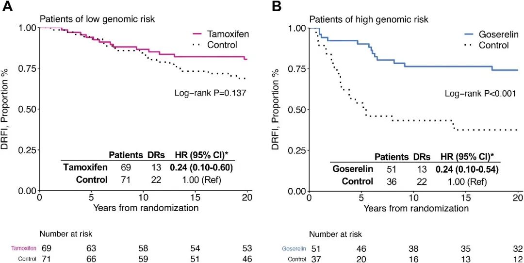 结果:在雌激素受体阳性患者群体中(n=584,中位年龄47岁),戈舍瑞林、他莫昔芬和联合用药相对于对照组的长期无远处复发间隔有显著改善(多变量风险比<hr/>,0.49;95%CI,0.32到0.75,HR,0.57;95%CI,0.38到0.87,HR,0.63;95%CI,0.42到0.94)。戈舍瑞林和他莫昔芬有显著的相互作用(P=0.016)。基因组低风险患者(n=305)显著受益于他莫昔芬(HR,0.24;95%CI,0.10至0.60),基因组高风险患者(n=158)显著受益于戈舍瑞林(HR,0.24;95%CI,0.10至0.54)。在基因组高风险患者中,戈舍瑞林治疗中添加他莫昔芬会增加风险(HR,3.36;95%CI,1.39至8.07)。此外,基因组低风险患者对他莫昔芬有20年的长期持续获益,而基因组高风险患者对戈舍瑞林仅有早期获益。