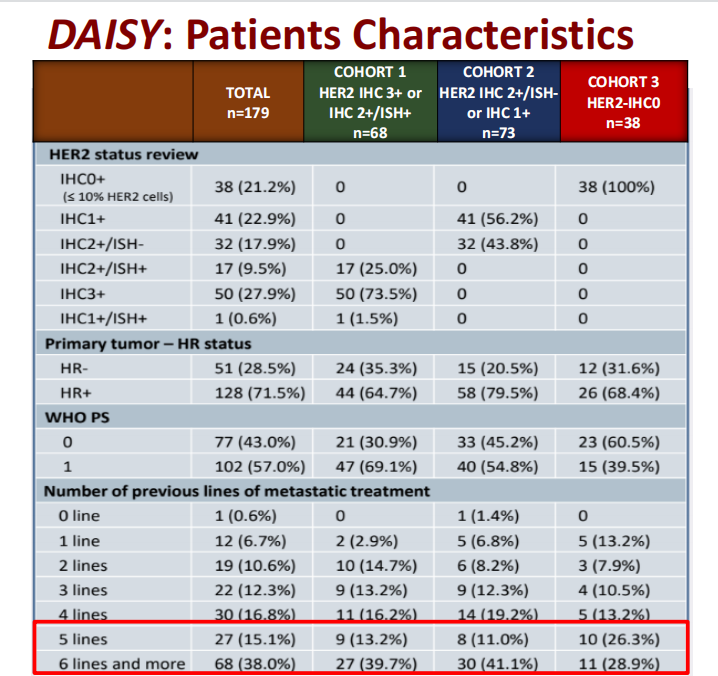 DAISY研究是一项多中心、开放标签的Ⅱ期试验,旨在通过广泛的生物标志物分析评估5.4 mg/kg剂量的单药T-DXd在晚期乳腺癌患者中的疗效。研究分为三个队列,分别为HER2过表达(IHC3+或IHC 2+/ISH+,队列1);HER2低表达(IHC2+/ISH-或IHC1+,队列2);HER2不表达(IHC0+,队列3)。主要研究终点是每个队列中研究者评估的最佳疗效(BOR),次要终点为中心评估的BOR,临床获益率(CBR),疗效持续时间(DoR),无进展生存期(PFS),总生存(OS)和安全性。