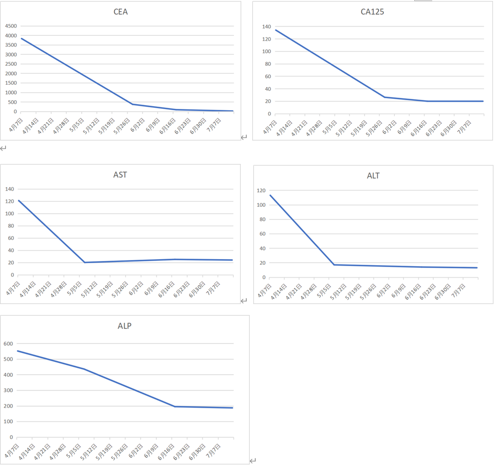 癌胚抗原(CEA):3830 ng/ml;肿瘤标记物(CA125):134 U/ml;