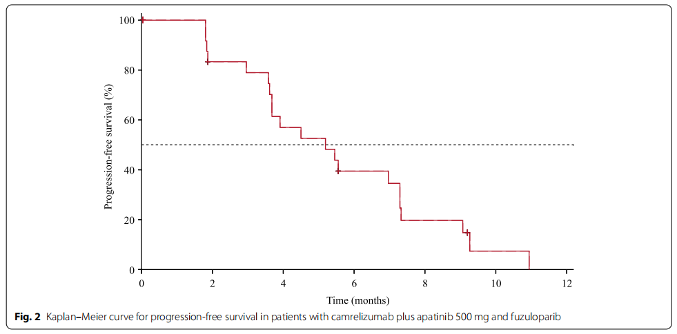 本研究共入组32例患者,3例患者接受了卡瑞利珠单抗200 mg+阿帕替尼375 mg+氟唑帕利100 mg,29例患者接受了卡瑞利珠单抗200 mg+阿帕替尼500 mg+氟唑帕利100 mg(临床推荐剂量),两组均未观察到DLT。最常见的≥3级治疗相关不良事件为白细胞计数降低(20.7%)、高血压(13.8%)、中性粒细胞计数降低(10.3%)和AST升高(10.3%)。2例患者因免疫介导的肝炎(n=1)和贫血、血小板计数降低、白细胞计数降低、丙氨酸氨基转移酶升高、天门冬氨酸氨基转移酶升高和γ-谷氨酰转移酶升高(n=1)而终止研究治疗。29例接受卡瑞利珠单抗200 mg+阿帕替尼500 mg+氟唑帕利100 mg治疗的患者中有2例(6.9%[95%CI:0.9~22.8])达到客观缓解,疾病控制率为62.1%(95%CI:42.3~79.3)。中位PFS为5.2个月(95%CI:3.6~7.3),12个月OS率为64.2%(95%CI:19.0~88.8)。