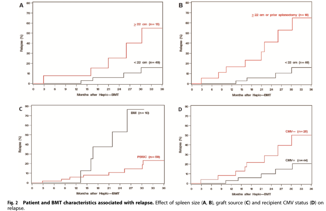 如上所述,在单因素分析中,多个变量与复发显着相关。在多因素分析的双变量模型中,在对受者年龄(HR 6.46,95%CI,1.85–22.6,P=0.004)、进行移植的年份(HR 5.47,95%CI,1.58–18.9,P=0.007)、受者CMV血清状况(HR 6.04,95%CI,1.93–18.9,P=0.002)、或移植物来源(HR 4.73,95%CI,1.18–18.9,P=0.028)进行调整后,脾脏≥22 cm或既往脾切除术仍与较高的复发风险独立相关。同样,骨髓来源移植物也得到相似结果。