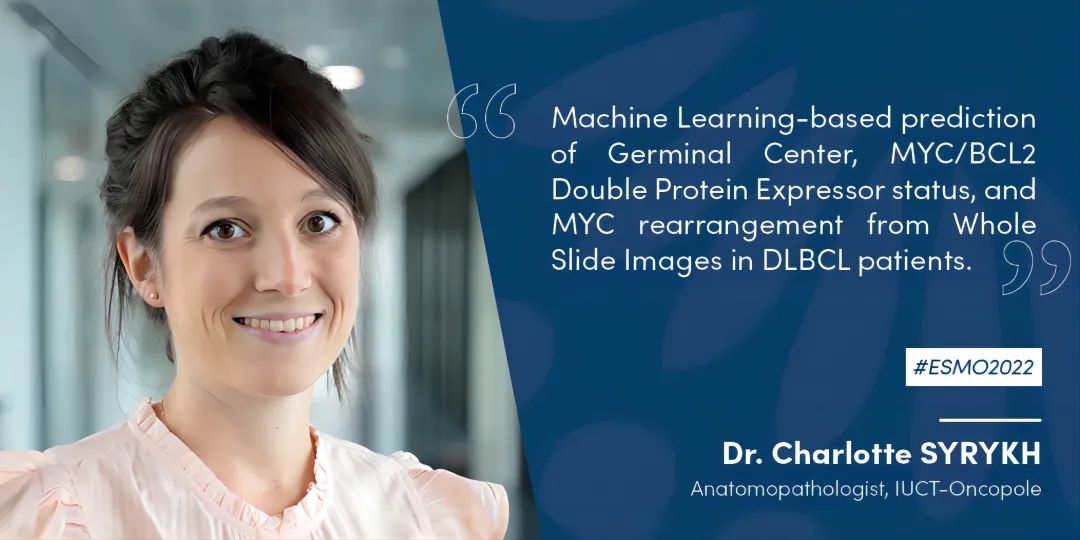编者按:2022年9月9日~13日,万众瞩目的欧洲肿瘤内科学会(ESMO)年会在法国首都巴黎的凡尔赛门展览馆隆重召开,作为全球范围内久负盛名的顶级学术会议,一如既往地吸引了来自全球范围内的肿瘤相关领域专家和学者齐聚一堂,共探肿瘤的诊疗进展。在本次ESMO大会上,来自法国的Charlotte Syrykh教授报告了一项基于机器学习(machine-learning)模式对MYC/BCL-2双表达及MYC重排的GCB亚型DLBCL患者的预后进行预测,为了更深入了解该方面的内容,《肿瘤瞭望》在ESMO大会现场特邀采访了Charlotte Syrykh教授,并针对该方面的内容进行了深入解读。
