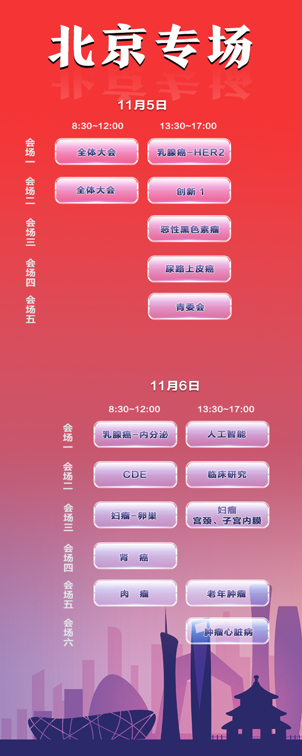 本届CSCO年会开幕式将在北京会场举行,此外,北京会场还设置了创新药物临床研究专场、CDE专场、人工智能专场、乳腺癌专场、恶性黑色素瘤专场、尿路上皮癌专场等;线上会议设置了头颈肿瘤、罕见肿瘤、胃癌、肝癌、结直肠癌、前列腺癌、小细胞肺癌、非小细胞肺癌、转化医学等专场,第十届亚洲临床肿瘤学联盟(FACO)会议也将在此期间举办;哈尔滨会场针对血液系统肿瘤设置了多个专场,济南会场也安排了放疗和免疫治疗相关专场。