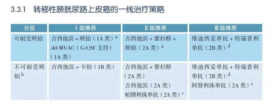 对于“既往免疫治疗失败”的患者,吉西他滨联合铂类化疗仍是主要选择,除此以外,Ⅱ级推荐中增加了Enfortumab Vedtin,主要基于EV201研究队列2的数据,在免疫治疗失败的铂类不能耐受人群中,该方案的ORR为51%,中位DOR为13.8个月,中位PFS和OS分别为6.7个月和16.1个月,美国FDA已经批准其相关适应症,但和FGFR抑制剂厄达替尼一样在国内尚不可及。