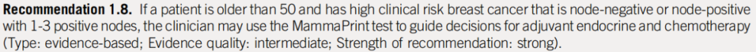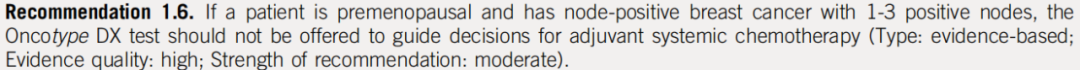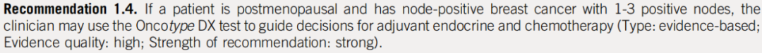 根据TAILORx研究和RxPONDER研究,指南对Oncotype Dx进行了更新,推荐其在绝经后患者(N0或N1-3)的使用,同时额外推荐其在绝经前淋巴结阴性患者的使用。