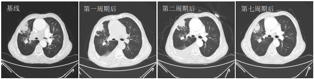 2022-05-19(第7周期治疗后)胸部CT:右肺占位复查,较前稍增大;纵隔及右肺门肿大淋巴结,大部分较前增大,双侧胸腔积液,两肺多个结节,考虑转移可能性大。2022-05-26完善CT引导下肺穿刺活检,病理为治疗后肿瘤性坏死,疗效综合评估:SD。