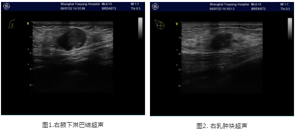 2021年6月8日乳房超声:右乳内见数个低回声区,较大者1点位20x10x18mm,边界欠清,形态欠规则,内见点状强回声,内见血流信号腋下:右侧见数个低回声区,较大者21x13mm,淋巴门结构不清晰,内见血流信号;